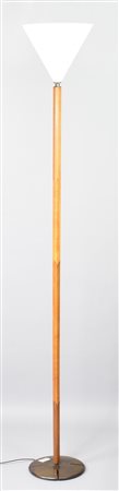 lampada da terra con struttura in legno di pero e base in metallo, parte superiore in vetro satin