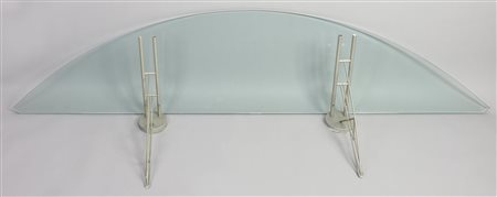 consolle di forma semi-ovale a muro, con struttura in metallo e ripiano in vetro