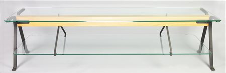 tavolino post-modernista con ripiano in cristallo temperato e struttura in metallo verniciato