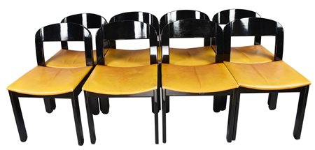 serie di 8 sedie in legno laccato nero e seduta rivestita in pelle