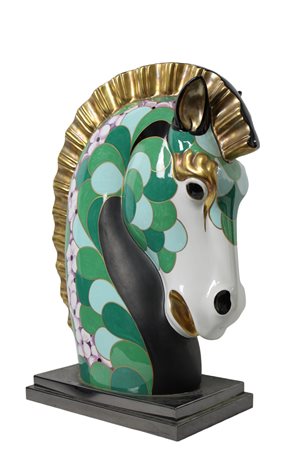 TESTA DI CAVALLO in porcellana policroma manifattura artistica produzione italiana - le porcellane- periodo anni 1980-2000 firmato h cm 60 x 40 x 21,5