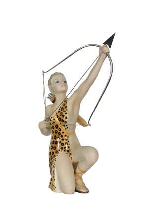 SCULTURA ICONICA in porcellana policroma raffigurante Diana la cacciatrice di Ronzan design Giovanni Ronzan firmata sotto la base periodo anni 40  h cm 48 x 12 x 46