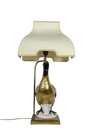 LAMPADA DA TAVOLA in porcellana policroma raffigurante un volatile produzione italiana periodo stimato anni 70  h cm 73 x 36 x 36