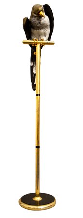 SCULTURA in porcellana policroma su piedistallo in ottone raffigurante falco nero e dorato produzione italiana periodo stimato anni 70/80 h cm 138