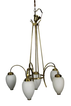LAMPADARIO A 5 LUCI con bocce satinate bianche e struttura in ottone produzione italiana anni 50  h cm 92 x 75
