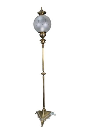 LAMPADA DA TERRA in ottone rigato lavorato con boccia satinata incisa produzione italiana anni 50 h cm 205 x 45