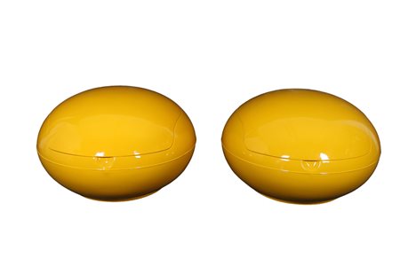 Coppia di poltrone vintage Garden Egg design Peter Ghyczy di colore giallo produzione tedesca periodo anni 60 . Una poltrona ha subito interventi di riparazione sul fondo