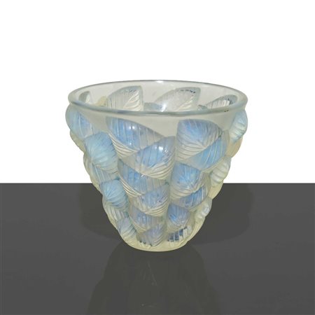Lotto 1 Renè Lalique - Vaso in vetro opalescente modello “Moissac” H cm 14 x 15 Vetro Vaso in vetro soffiato con rilievi a foglie. Firma stampata a rilievo. Modello creato nel 1927.