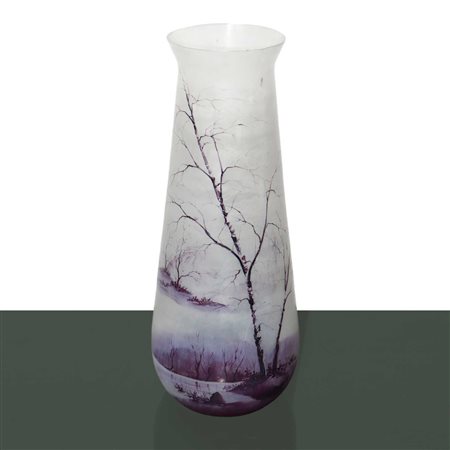 Lotto 5 Vaso in vetro satinato, dipinto a smalto a mano con paesaggio, primi 20th secolo H cm 28 x 13 Dipinto nei toni del viola.Dipinto nei toni del viola.