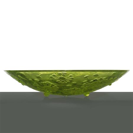 Lotto 11 Lalique France (1888) - Centrotavola in vetro verde con decori floreali Marchio Lalique France sul bordo esterno della parte inferiore.Marchio Lalique France sul bordo esterno della parte inferiore.