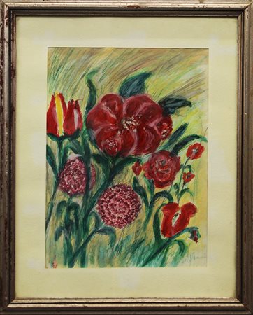 Lotto 5 LIA RIBANI, "Fiori", anni '60, tecnica mista su cartoncino, dim 46x37 cm. Al fronte: firma in basso a destra. Opera con cornice.
