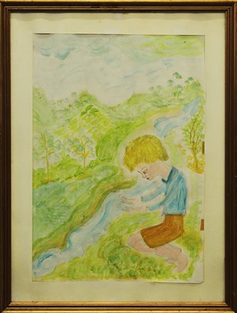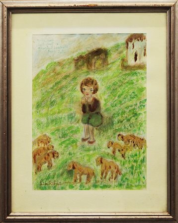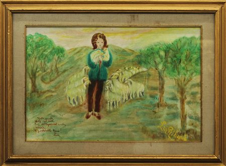 Lotto 6 LIA RIBANI, "Pastorello", anni '60, tecnica mista su cartoncino, dim 46x36 cm. Al fronte: firma in basso a sinistra e in alto a sinistra: "Nella pace delle verdi valli assorto il pastorello tace". Opera con cornice.