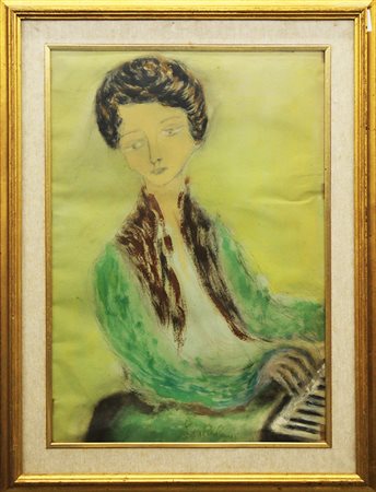 Lotto 7 LIA RIBANI, "Donna che suona il piano", anni '70, tecnica mista su cartoncino, dim 50x35 cm. Al fronte: firma in basso al centro. Opera con cornice.