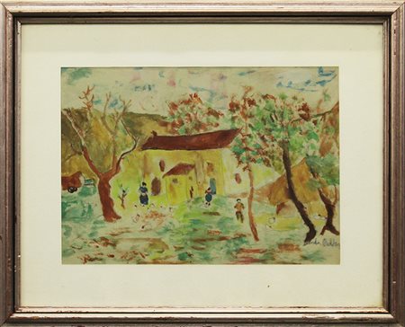 Lotto 11 LINDA RIBANI, "Paesaggio", anni '70, tecnica mista su cartoncino, dim 22x31 cm. Al fronte: firma in basso a destra. Opera con cornice.