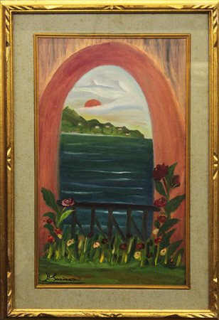 Lotto 16 R. SEMINARA, "Corvo sul terrazzo fiorito al tramonto sul mare", 1984, olio su tela, dim 40x30 cm. Al verso: firma e anno in basso.