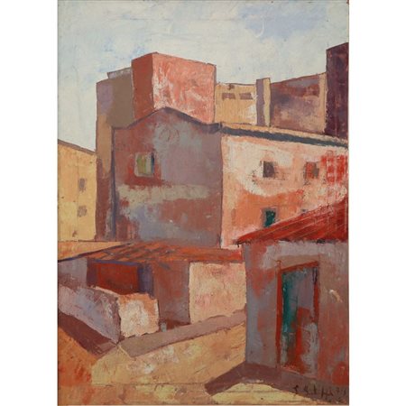 Lotto 20 Natalia Criscione (Catania 1938) - Caseggiati, 1962 cm 64x48 in cornice 82,5x66,5 Olio su masonite Firmato in basso a sinistra