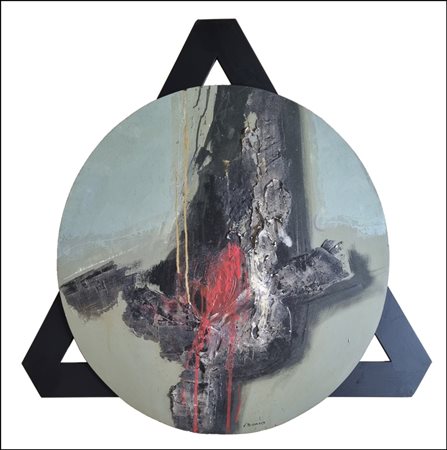 Lotto 6 BISSACCO MARTINO Taglio di Po 1941 "Il tempo e la forma" Tecnica mista su tavola circolare, diam. cm 80, applicata su supporto in legno cm 98x98 (totali). Firmata sul fronte in basso a destra, al verso misure, titolo e firma.