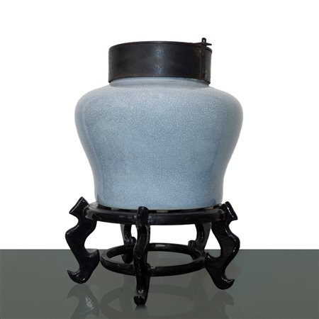Lotto 15 Grande urna in porcellana cinese, 19° secolo H cm 27.5x27.5 - Base H cm 15 Grande urna in porcellana cinese colore azzurro, con coperchio in metallo.Grande urna in porcellana cinese colore azzurro, con coperchio in metallo.