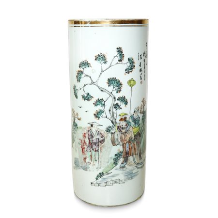 Lotto 16 Vaso cinese a rollo cilindrico in porcellana famiglia rosa dinastia Quinq, 19° secolo H cm 18.5x12.4 Vaso cinese in porcellana famiglia rosa con raffigurazione di figure di uomini e albero. Iscrizioni con caratteri cinesi e decorazioni dorate. Timbro di cera lacca alla base. Documenti "Certificate of identity" - Hong Kong Art Craft Group all'interno.Vaso cinese in porcellana famiglia rosa con raffigurazione di figure di uomini e albero. Iscrizioni con caratteri cinesi e decorazioni dorate. Timbro di cera lacca alla base. Documenti "Certificate of identity" - Hong Kong Art Craft Group all'interno.