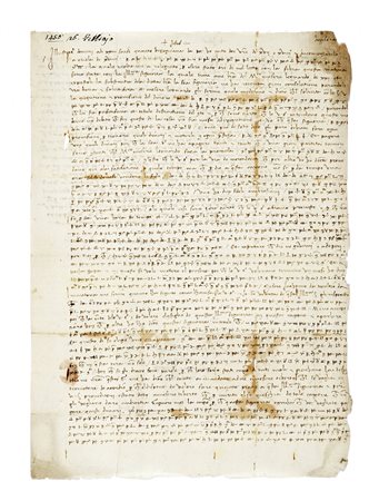 Manoscritto a inchiostro bruno. 1 carta, scritto recto e verso. Insieme alla lettera anche la trascrizione del testo cifrato. Al verso il nome del destinatario e traccia di sigillo in ceralacca. Dimensioni: 295x210 mm. (1) La lettera è inviata ai Capitani della città di Milano durante l'assedio da parte di Francesco Sforza, con il testo in buona parte cifrato (tranne l'incipit, la data i fine e alcuni brevi sezioni), come era in uso nella diplomazia quattrocentesca. Gli scontri del febbraio 1450 passati alla storia come la Rivolta di Milano – ebbero come causa la grave carestia dovuta al blocco dei rifornimenti alla città da parte di Francesco Sforza, oltre alla debolezza della Repubblica Ambrosiana. La rivolta determinò la fine della Repubblica Ambrosiana e la restaurazione del Ducato di Milano con a capo Francesco Sforza. -