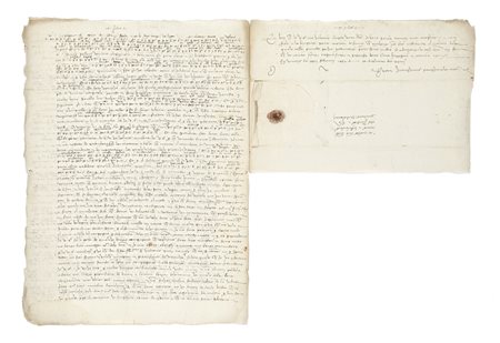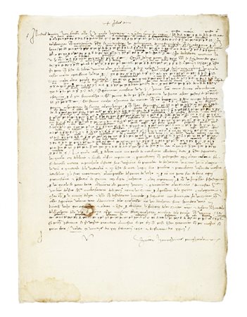 Manoscritto a inchiostro bruno. 1 bifolio, scritte 3 pagine. La parte inferiore della seconda carta è stata tagliata (non è presente). E' comunque conservato il sigillo e i nomi dei destinatari. Sulla sezione cifrata della lettera è indicata la trascrizione del testo. Dimensioni: 295x210 mm. (1) Enrico Panigarola fu ambasciatore dell'Aurea Repubblica Ambrosiana a Venezia. La lettera è inviata ai Capitani della città di Milano durante l'assedio da parte di Francesco Sforza, con il testo in buona parte cifrato (a parte l'incipit, la data i fine e alcuni brevi sezioni), come era in uso nella diplomazia quattrocentesca. Gli scontri del febbraio 1450 passati alla storia come la Rivolta di Milano – ebbero come causa la grave carestia dovuta al blocco dei rifornimenti alla città da parte di Francesco Sforza, oltre alla debolezza della Repubblica Ambrosiana. La rivolta determinò la fine della Repubblica Ambrosiana e la restaurazione del Ducato di Milano con a capo Francesco Sforza. -