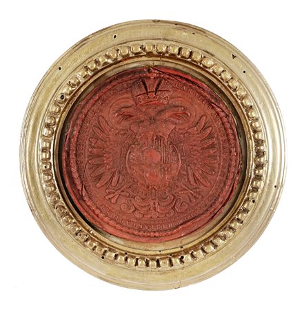 Sigillo di Carlo VI in ceralacca rossa, applicato su legno con cornice tonda dorata. Datazione: tra il 1711 ed il 1740. Il sigillo raffigura lo stemma asburgico di Carlo VI e reca al bordo l'iscrizione: Carolus VI Romanorum Imperator Hispaniarum et utriusque Siciliae Rex. Sul retro, nota manoscritta moderna e francobollo austriaco commemorativo di Carlo VI, del 1908. Piccoli segni sulla cera ma integro e ben conservato. Dimensioni (sigillo): diametro 114 mm. (1) -