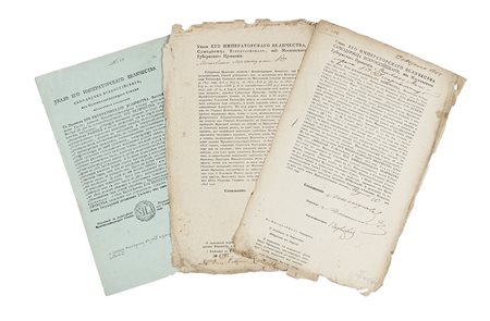 Documenti a stampa. Gli anni sono: 1738/40/97/98/99, 1800/01/45. Dimensioni: 203x370 mm ca. (28) I documenti sono emessi in nome della zarina Anna e degli zar Paolo, Alessandro I e Nicola I. Gli argomenti sono i più vari: un annuncio di nozze di parenti della zarina Anna, l'assegnazione di alloggi a ufficiali e civili, trasferimenti, monete, contenziosi, Consiglieri di Stato, remissione di pene pecuniarie, eredità e doti, disposizioni relative alla nomina a Zar di Alessandro I, elezioni di Collegi, terreni di chiese, organi di polizia, disposizioni religiose, tribunali, erario, tesoreria, ecc. -