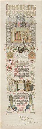 Grande cromolitografia policroma con scritte ornate in caratteri Vyaz' (cirillico antico) color oro, nero e cinabro, che incorniciano un'antica scene di incoronazione, riccamente decorata, e un rituale simbolico. Datata 1896, 14 maggio (calendario giuliano ortodosso) che corrisponde al 26 maggio gregoriano. Su disegno, firmato a stampa, del grande pittore russo Viktor Mikhailovich Vasnetsov. Dimensioni: mm 930x330. (1) Intestazione in Vyaz': Santa Incoronazione di Sua Maestà l'Imperatore Nikolai Alexandrovich e di Sua Maestà l'Imperatrice Aleksandra Feodorovna. I partecipanti al banchetto trovarono questo straordinario menu arrotolato accanto alle preziose posate. Vasnetsov lo volle creare in stile medievale, sia nel formato, sia nei caratteri slavi antichi, sia nell'iconografia. L' immagine principale è l'incoronazione del primo zar Romanov, Mikhail Feodorovich (1613) sovrastata dalle cupole della Cattedrale della Dormizione, luogo dell'investitura di Nicola e Aleksandra; la seconda immagine riproduce l'antica usanza dei boiardi e del popolo che salutavano lo zar con pane e sale; la terza raffigura due pavoni, uccelli magici per la tradizione russa. Il tutto, riccamente decorato da simboli e stemmi araldici e completato con preghiere augurali e versi di glorificazione. Il menu, scritto in russo moderno, prevedeva rassol'nik (zuppa tradizionale a base di cetrioli sottaceto), borschok (borsh, zuppa di barbabietole), pirozhki (fagottini ripieni); storioni al vapore, agnello, galantina di fagiani; capponi arrosto, insalata, asparagi; per dessert, frutta nel vino e gelato. -