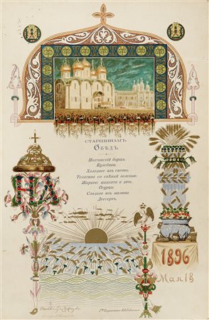 Cromolitografia policroma con scritte color blu, oro, e cinabro sovrastate dall'immagine della cattedrale della Dormizione, luogo dell'incoronazione, e circondate da simboli ornamentali russi. Datata 18 marzo 1896 (calendario giuliano ortodosso). Su disegno, firmato a stampa, del pittore Apollinaire Vasnetsov. Dimensioni mm 420x280. (1) Scritto in russo moderno, il menu comprendeva: borsh alla Poldava, kuleibiaka (torta salata), lavarello freddo, vitello con insalata, pollo e selvaggina, cetrioli; per dessert, dolce ai lamponi. -