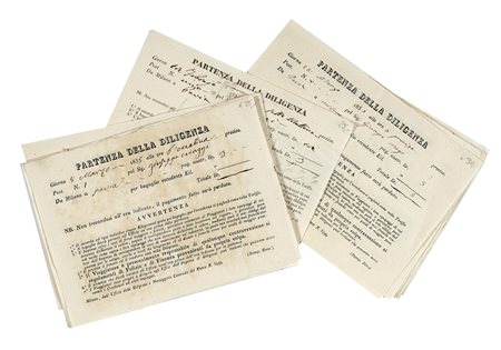 Manoscritti a inchiostro nero e blu. Dimensioni varie. SI AGGIUNGE: Cisari Giulio. Insieme di 9 tra lettere e biglietti autografi firmati dell'artista (1 lettera è dattiloscritta con firma autografa), 1 biglietto autografo firmato della moglie Nella, datati Anni '40, buste con francobolli conservate (i biglietti hanno stampate illustrazioni di Cisari a colori); 4 depliant pubblicitari e 1 biglietto con illustrazioni di Cisari (materiale a stampa). Dimensioni varie. (137) I DOCUMENTO: La raccolta documenti comprende: 1 cartolina postale non viaggiata, con fotografia del monumento a Baracca, firmata (sulla foto) da Italo Balbo - 1 lettera dattiloscritta del 1937-XV, intestata Gruppo Medaglie d'Oro, firmata dall'amm. Costanzo Ciano di Corlellazzo - 1 biglietto da visita, datato 1884, con nota autografa del ministro Pasquale Stanislao Mancini - 1 decreto su carta intestata del regno d'Italia, relativo alla Santa Lega Italiana, firmato dal ministro Luigi Carlo Farini, s.d. (ma 1860) - 1 lettera autografa firmata da Terenzio Mamiani (1855) - 1 biglietto del 1910 con nota autografa firmata dello scrittore francese Octave Mirbeau - 1 carolina postale del 1906 con 2 versi autografi firmati del poeta Giovanni Marradi - 1 fotocartolina anni '20 del deputato Umberto Merlin - 1 cartolina postale Italia Letteraria del 1929 con nota e firma aut. Di Enrico Falqui - 2 telegrammi (dattiloscritti) del 1963 inviati da Kerkyra (Corfù), da Camilla Cederna e dalla madre Ersilia - 1 lettera aut. firmata, del 1923, di Alberto Ostali, relativa alla pubblicità all'autodromo di Monza - 1 cartolina del 1938 con firma aut. Da Alberto Tallone - 1 lettera del 1878, aut. Firmata di Bettino Ricasoli, con busta - 2 decreti, del 1869 e '70, su carta intestata, con firme autografe di Vittorio Emanuele II - 1 lettera di trasmissione del 1869 con firma aut. dell'astronomo (Giovanni) Schiaparelli - 1 programma di attacco in Etiopia, anni '30 su carta intestata L'Alto Commissario per l'Africa Orientale con destinatario (col. Armellini), sigla e visto autografi (a matita) di Pietro Badoglio - 1 documento intestato con timbro a secco, del 1953, con firme autografe del presidente Luigi Einaudi e del ministro G. Pella; - 1 assegnazione di medaglia del 1970, con firma (a stampa) del sindaco Aldo Aniasi - 1 fotografia di Francesco de Pinedo, autografata - 1 fotografia con dedica, del 1910, di Eleonora Perry – 1 cartolina postale del 1921, viaggiata, con fotografia della Madonnina, testo a stampa di una poesia in dialetto milanese di Gianfranco Casati e firma autografa del poeta - 1 biglietto autografo di Primo Conti - 1 lettera autografa di Piero Chiara - 1 cartolina di Giuseppe Prezzolini – 15 lettere autografe (sono 3 dattiloscritte con firma autografa, alcune su carta intestata La Gazzetta dello Sport) di Gianni Brera – 2 lettere di Felice Cavallotti – 1 album contenente 40 cartoline, depliant ecc di artisti: tra i nomi Massimo Campigli (3 cartoline), Gae Aulenti, Raimondo Giovanetti, Carlo Casanova, Mario Borgiotti, Aligi Sassu, Ernesto Treccani, Vanni Scheiwiller, Carlo Cardazzo, Domenico Cantatore, Bepi Modolo, Timo Bortolotti, Gino Marussig, Umberto Marigliani, Pietro Repossi, Luigi Grosso, Vittorio Gregotti ecc. - 5 lettere dattiloscritte con firme autografe di Mariano Rumor – 1 lettera dattiloscritta con firma autografa di Alberto Albertini (Direttore del Corriere della Sera) – 2 cartoline autografe di Vittorio Gnecchi – 1 lettera con firma autografa di Giovanni Giolitti su carta intestata "Il Ministro del Tesoro" - 1 foto di scultura con firma di Claudio Girola, 1977 - 1 disegno a matita con dedica firmata di Minni Tomasini, 1964 - 1 disegno a colori con firma di Amleto del Grosso -1 foto di scultura con firma di Claudio Girola - 1 foto cartolina di scultura con firma di Luigi Grosso - 1 catalogo mostra con firma di Gino Mazzoli, 1952 - 1 catalogo mostra con dedica firmata di Guido Botta, 1951 - 1 catalogo mostra Arti Figurative Genova (1948) con firme di tutti i 18 artisti - 1 presentazione mostra con dedica firmata di Duilio Remondino -1 foto cartolina di dipinto con firma di (Jaques) Engel - 3 foto cartoline di sculture con firma di Giulio Cassani - 1 foto cartolina di dipinto con firma di (Giuseppe) Spampinato - Curiosità: 15 ricevute stampate e completate a mano per viaggi in Diligenza da Milano a Pavia – anni 1834-41, con indicato l'orario di partenza, il prezzo in Lire austriache e l'eventuale (e quanto mai attuale) sovrapprezzo per l'eccedenza di peso del bagaglio. -