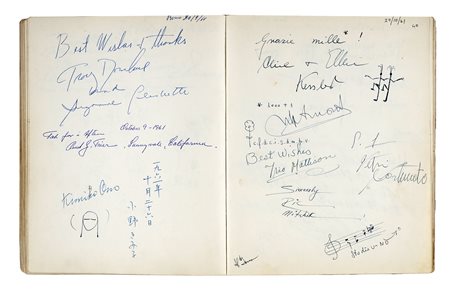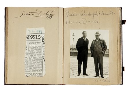 Liber Amicorum di circa 60 pagine in cartoncino beige, non numerate e utilizzate in gran parte recto e verso. Le firme, annotazioni, citazioni musicali e dediche sono tutte autografe. Le fotografie sono incollate alle pagine o unite al volume con brachette. Nell'album anche alcuni ritagli di giornale che raccontano l'arrivo del celebre personaggio. Legatura in pelle con difetti. Al dorso, le stampigliature Autografi e Boris Skerl. Dimensioni: 175x240 mm. (1) Straordinario Liber Amicorum appartenuto a Boris Skerl, direttore di alcuni storici hotels italiani (Excelsior Firenze, Danieli Venezia, des Iles Borromées Stresa). Grazie alla sua professione Skerl, stimatissimo dalla clientela, ebbe modo di entrare in contatto e farsi lasciare un ricordo da molti dei grandi protagonisti della storia del '900. I nomi più famosi sono (nell'ordine del volume): Giacomo Puccini (foto cartolina con firma e data, Torre del Lago '08) - alcuni esponenti della famiglia Savoia – Tyron Power e Linda Christian (firme) - Henry Bordeaux, scrittore (dedica e firma) – Stefan Zweig (dedica, data '32, e firma) – Franz Lehar (foto cartolina con dedica, data '26, e firma) – Arthur Rubinstein (firma con data '37 più fotografia che lo ritrae di spalle a Firenze, con Boris Skerl) – Richard Strauss (foto ritratto con firma e data '32) – Alfonso XIII, ex re di Spagna (foto ritratto con firma e data '33) – Arturo Toscanini (foto ritratto con firma e data '38) – Marcello Piacentini, architetto (firma e data '35-XIV) – Guglielmo Marconi e la seconda moglie Maria Cristina (foto ritratto con firme) – Alexander Moissi, attore (foto ritratto con dedica, firma e data '34) – Titta Ruffo (cartolina di ringraziamento, con firma e data '46) – Tullio Serafin (foto ritratto con dedica, firma e data '34) – Vittorio de Sica (firma e data '37) – Mariano Stabile, baritono (firma e data '37) – Tito Schipa (firma e data '49) – Beniamino Gigli (foto ritratto con dedica firmata) - Salvador Dalì (firma e data '48) - William Randolph Hearst e Marion Davies (firme) – Rodolfo Graziani, generale (foto cartolina con firma) – Ras Sejum Mangascià Johannes (firma) - Titta Ruffo (foto ritratto più foglietto di auguri dattiloscritto con firma) – Werner von Blomberg, generale (firma con data '37 più foto ritratto) – Adriano Lualdi (citazione musicale da Lumawig e la saetta, con firma e data, Firenze maggio '38-XVI) – Umberto Giordano (citazione musicale da Andréa Chénier, con firma e data '37-XVI) – Italo Montemezzi (citazione musicale, firma e data) – Richard Strauss (citazione musicale firmata e datata) - Nino Cattozzo (citazione musicale da I misteri Gaudiosi con firma e data XVI) – G. Francesco Malipiero (citazione musicale da Antonio e Cleopatra, con firma e data, Firenze '38-XVI, più biglietto di auguri firmato) - Gino Marinuzzi (citazione musicale da Palla de' Mozzi, con firma e data XVII) - Arturo Benedetti Michelangeli (foto ritratto con dedica, firma e data, '40) - Igor Stravinskiy (citazione musicale, con firma e data Firenze '39) – Pietro Mascagni (citazione musicale dall'Intermezzo di Cavalleria Rusticana, con firma e data Firenze '40) - Wilhelm Furtwängler (foto con altri personaggi più firma e data '41) - Herbert von Karajan (dedica a piena pagina durante un soggiorno a Firenze, con firma e data '41) - Wilhelm Backhaus (citazione musicale da un concerto di Beethoven, con dedica, firma e data '41) – Ildebrando Pizzetti (citazione musicale dalla cantata Epithalamium, con firma e data '42-XX) – Gino Marinuzzi (ritratto fotografico con firma e data, Firenze '44-XX) – Occupazione americana a Firenze nel '44 (2 fotografie di cui una con il gen. Clark e Boris Skerl più 3 ritagli di giornale) – Eduard, duke of Windsor e Wallis Simpson, che si firma Windsor (2 fotografie dei Duchi con Boris Skerl, vari ritagli di giornale sulla loro visita a Firenze e le firme, con data '47) – Mark W. Clark, generale (tre fotografie con Boris Skerl e una lettera dattiloscritta con firma autografa) – Arturo Benedetti Michelangeli (foto delle sue mani al pianoforte con dedica firmata e data '48, insieme ad altra firma autografa e 1 cartolina di saluto firmata) – Alfred Cortot (foto ritratto con dedica più nota con firma e data, Firenze '48) - Archibald J. Cronin (dedica firmata con data, '48 più ritaglio di giornale su sua visita a Firenze) – M. Reza Pahlavi (firma in grafia occidentale più piccola fotografia) – Sarat Chandra Bose, attivista politico indiano (firma con indirizzo di Calcutta e data, '48) – Andrés Segovia (firma con data, '48)- Sinclair Lewis, premio Nobel (firma con data, '48 e ritaglio giornale su sua visita a Firenze) - Gérard Philipe (nota da Venezia con firma e data '49) – Totò (firma) – Achille D'Angelo, il Mago di Napoli (fotografia con Boris Sterkl, con dedica e data '50, più nota con firma e data, Venezia '49) – Mario Peragallo (firma con data, '50) – Pietro Annigoni (firma con data '50, con schizzetto stilizzato) - Alberto Moravia (firma con data, Venezia 1950) – Giorgio de Chirico (firma con data, Venezia '49) - Walter Gieseking (firma con data '50) - Yehudi Menuhin, violionista (firma con data '50) – Ossip Zakine, scultore (firma e ritaglio giornale) – Ira Gershwin, compositore e fratello di George (nota dal Danieli con firma e data '50) - Harold Lloyd (nota di ringraziamento firmata con piccolo schizzo dei suoi famosi occhiali tondi) -Victor de Sabata (firma) - Nam Phương, imperatrice d'Indocina (firma e data '50) - Alexander Brailowsky, pianista (firma e data '52) – John Steinbeck (firma e data) - Antonio Berti (firma con data '52 più rapido schizzo di Piazza San Marco) – Albert Steffen, scrittore (firma e data '53) - Walt Disney (iconica firma di grandi dimensioni con grafia artistica) - Bernard Montgomery, Field Marchal (firma: Montgomery of Alamein e data '51) – Le Corbusier (firma e data '52) – Cesare Giulio Viola, commediog