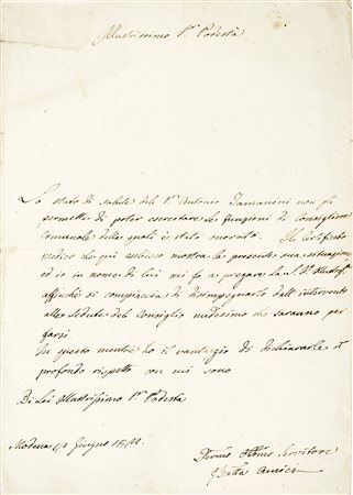 Manoscritti a inchiostro bruno. 4 pagine scritte in totale. Dimensioni varie. (2) Giovanni Battista Amici (1786-1863) è stato un ingegnere, matematico e fisico. Dalla metà degli anni '20 del XIX secolo si dedicò alla costruzione di strumenti ottici: microscopi e telescopi. Nella lunga lettera alla moglie, Teresa Tamanini, Amici - raccontando di alcuni sonetti del Papi (probabilmente il medico orientalista lucchese Lazzaro Papi) che hanno a che fare con il telescopio – raccolta a lungo di questo strumento: "[...] Per altro se egli vuole divertirsi a stendere la storia lo faccia puree io sono pronto a compiacerlo [...] spero però che fatti gli esperimenti dei miei nuovi telescopj anche i più increduli di costà si persuaderanno senz'altro [...] Ti dirò poi che qui quasi tutti sanno che lo specchio comperato dal Governo è stato dal Gualtieri riportato a Modena per pulirlo di nuovo. Il signor Cavaliere Cesaris mi ha detto chiaramente e mi ha commissionato di comunicare al Ministro che il telescopio non è della perfezione di quello di Herschel [...]. Anche i telescopi di Napoli sono andati a vuoto: e so dall'astronomo che niuna commissione vi è dato poiché sono ancora indecisi se rivolgersi debbono piuttosto dalla parte degli acromatici [...]". La lettera al Podestà è finalizzata ad ottenere le dimissioni del suocero (l'editore e libraio modenese Antonio Tamaini) – ormai anziano – da consigliere comunale. -