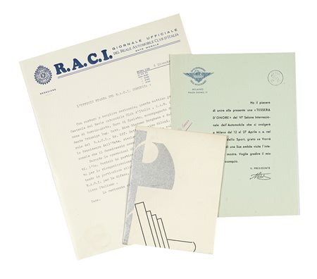 Manoscritto a inchiostro nero. 1 carta scritta al recto. Su carta con timbro a secco Il Ministro dell'Aeronautica. Busta conservata. Dimensioni: 290x220 mm. SI AGGIUNGONO: 1 lettera autografa dell'ammiraglio Paolo Thaon di Revel inviata a Parisio - 1 comunicazione dell'Ufficio Stampa del R.A.C.I. (su carta intestata) nella quale si informa di una cerimonia presso la sede centrale del Reale Automobile Club Italia datata 1934 - 1 invito al VI Salone Internazionale dell'Automobile a Milano - 1 invito per assistere alla sfilata della Sagra del Motore a Genova (1933) - 1 invito per il Gran Premio Automobilistico Targa Abruzzo e Coppa Acerbo - 1 invito per l'inaugurazione della Biblioteca d'Annunzio a Pescara (1934) anche in occasione della Coppa Acerbo. (7) I DOCUMENTO: Lettera inviata a Parisio, Commissario al R.A.C.I.: [...] Ascolta Chierici e aiuta l'infelicissimo automobil club di Ferrara! Te ne sarò gratissimo [...]. -