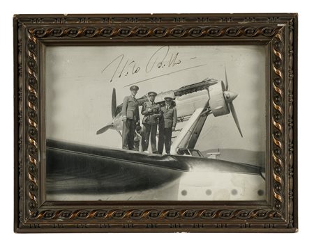 Fotografia d'epoca in b/n con firma autografa Italo Balbo. Sul retro annotazione di altra mano. Minimi segni del tempo ai margini. Con cornice. Dimensioni foto 215x160 mm. (1) La fotografia ritrae il Maresciallo dell'aria Balbo, in alta uniforme dell'aeronautica, tra due ufficiali piloti, sull'ala del suo idrovolante Savoia-Marchetti S.55X battezzato I-Balb, uno dei 25 che intrapresero la crociera aerea Italia-America del Nord nel '33 (Orbetello – Chicago – New York – Roma). Dietro ai tre ufficiali, spicca la potentissima doppia motorizzazione centrale Isotta Fraschini, a eliche contrapposte, che caratterizzava questi speciali idrovolanti. -