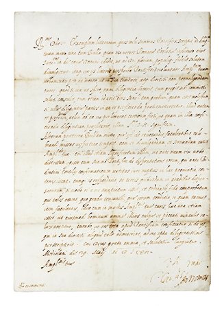 Manoscritto a inchiostro bruno. 1 bifolio, scritta 1 pagina. Testo in latino. Al verso il nome del destinatario, alcune note di altra mano, traccia di sigillo in ceralacca e alcune tracce di carta gommata grigia. Piegature della carta. Dimensioni: 310x215 mm. (1) Incipit: Exemplum litterarum quas mihi summus Pontifex scripsit [...] tuam mitto una Bulla quam ex vetere Roma a Ecclesia instituto eius Sanc.tas in di.o cana Domini editit, ut Dei gloriam populiq. Fidelis salutem divulgitur [...]. La lettera è scritta da Milano. -