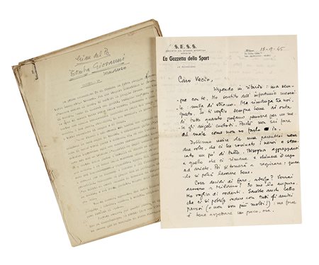 Dattiloscritto a inchiostro nero e blu con note e numerose correzioni autografe, inviato a Baldini Rualis che evidentemente non lo fece pubblicare. 81 pagine numerate su carta da minuta, con intestazione autografa Gian del Po (pseudonimo giovanile di Gianni Brera) Bomba Giovanni Romanzo. In calce, nota autografa: Gian del Po - presso Brera - via Catalani 43 Milano. Fogli sciolti, raggruppati in 14 capitoli graffettati, avvolti in una vecchia carta bianca con la scritta autografa Romanzo di Gianni Brera. SI AGGIUNGONO: 2 lettere di Gianni Brera e 1 lettera di Antonio Baldini Rualis. Datate 1945. (4) I DOCUMENTO: Il romanzo è ambientato in Wisconsin, nel periodo della grande migrazione verso l'ovest. La trama è western, ma nell'ambito dell'emigrazione italiana, con alcune situazioni che anticipano in modo sorprendente un notissimo film americano del 1990. Protagonista è un emigrato italiano della bassa pavese (la terra di Brera), Giovanni (Joe) Brambilla, detto Bomba, che si ritrova con altri coloni in una sparatoria tra indiani locali e truppe yankees. Rimasto quasi illeso ma solo, riesce a soccorrere e salvare un vecchio capo indiano gravemente ferito, che lo introduce nella tribù, dove Joe si accasa fino a diventare membro della comunità, sposando una ragazza nativa, da cui avrà una figlia. Recatosi nella vicina Green Lake City per fare acquisti, perde drammaticamente famiglia e amici della tribù in un attacco yankee. Distrutto dal dolore, si consola con il whisky e comincia una nuova vita in città. Alterne vicende lo portano ad adottare un'altra figlia, di origine ispanica, e ad incontrare alcuni emigranti italiani. Non raccontiamo il finale, ricordando solo che il protagonista e i nuovi amici emigranti hanno un gran desiderio di tornare in Italia. Dice Giovanni (Joe) Brambilla nelle ultime pagine: chi crede nemica la propria terra, non può trovare di meglio altrove, l'ho capito troppo tardi. Gianni Brera riprenderà i personaggi del padano Brambilla e della ragazza indiana nel romanzo Brambilla e la squaw pubblicato postumo nel 2012. Nella nuova narrazione il protagonista cambierà nome da Giovanni a Carlo, medico mazziniano emigrato nel Missouri (anziché Wiscounsin), che vivrà felicemente in una tribù indiana ed avrà una storia d'amore con una bella nativa. II DOCUMENTO: Lettera di Brera inviata al Carissimo Vecio (Antonio Baldini Rualis) datata 5 agosto 1945. Dattiloscritto a inchiostro nero, con note e firma autografe. Accorata missiva di argomento politico e familiare che racconta del periodo partigiano e dell'arrivo in Gazzetta: Carissimo Vecio, [...] So che stai bene, che hai buoni propositi di lavoro [...] comunque, grandi spaghi a Pavia, con gente che mi voleva far la pelle ogni giorno: ceffi di galera in portineria al giornale: fascisti estremisti che friggevano [...] Scappai in giugno: Svizzera: poi in settembre il P.C. mi mandò in Italia (Ossola) a far il partigiano. Fui aiutante maggiore di una brigata garibaldina, che dopo la rioccupazione condussi in montagna [...] io scesi a Milano, a veder mio figlio. Ed era morto due giorni prima! Poi morì mio padre, e la famiglia si sfasciò definitivamente [...] Bruno Roghi, della Gazzetta, mi ha offerto un posto: incomincerei a settembre: sono anzi già assunto: vivrei: e avrei tempo di non perder...tempo a fare il giornalista. Ti confesso (e sia detto tra noi) che dopo le esperienze pavesi non ho affatto voglia di interessarmi ancora alla politica. Al diavolo tutti. Questo è un paese dannato [...] sarò buon comunista in tutto quello che scriverò, se saprò scrivere. Ma in un giornale a dir corbellerie, mai più [...] Voglio vivere cinque anni bene e non più perdendo tempo per il panino. Ricomincerò dai racconti che tu mi facevi scrivere, con qualche callo in più sull'indice, ma con lo stesso spirito. Che ne dici? Meglio del giornalismo, per questi tempi, va l'editoria e tu saresti l'uomo tecnico adatto a far fiorire qualsiasi impresa del genere [...] Ti abbraccio Gianni. Nell'altra lettera ad Antonio Baldini Rualis, datata 18 settembre 1945 si legge un amaro sfogo scritto da Brera nei difficili anni del primo dopoguerra: Caro Vecio, [...] Io ti voglio bene ad onta di quanto possano pensare [...] Perché non sai fare del male come non so farlo io. Bisogna uscire da una parentesi nera due volte, che ci ha rovinato nervi e i stroncato un po' di tutto. Bisogna aggrapparsi a quello che ci rimane e chinare il capo ad ariete: Poi si tornerà a respirare: quando si potrà lavorare bene [...] Io, come vedi, sono diventato gazzettiano, un lavoro così così. Da impiegato, un tantino, ma me ne fotto. Il panino, oggi. E quando avrò una casa con qualcosa in più d'un tavolo prestatomi da un collega e delle sedie di vimini [...] mi dedicherò a un lavoro privato un po' più serio. Ora campo. Unico lavoro serio fatto: traduzione di Molière: Misantropo, Tartufo, Avaro. E una prefazione di 40 pagine [...] Stop. Romanzettacci inutili poi, per i quattrini. Ma mi sono fermato. Scriverò, se scriverò, sul serio [...] Un caro abbraccio Gianni. Nella lettera di Antonio Baldini Rualis si legge: [...] Perché ho visto in tutta la tua azione, da quella svolta al Popolo a quella di cui mi rendi edotto con la tua del 5 di questo mese, una dirittura, un cuore, una sincerità che purtroppo mancano al 999 per mille degli uomini di oggi. Seguono accenni ai propositi editoriali in veneto, al desiderio di tornare a lavorare insieme, alle condoglianze per le disgrazie familiari subite da Brera. -
