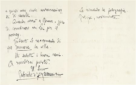 Manoscritto autografo a penna nera. 1 bifolio (3 pagine scritte). Carta con intestazione La Capponcina / Settignano di Desiderio / Firenze. Carta con filigrana. Dimensioni 175x220 mm. (1) L'indirizzo (Settignano di Desiderio), che d'Annunzio fa stampare sulla carta intestata della Capponcina, contiene un curioso doppio senso: se da un lato ricorda lo scultore rinascimentale Desiderio da Settignano, dall'altro con la locuzione di Desiderio allude alle ardenti passioni amorose del Vate. Questa lettera è inviata all'amico Francescangeli, probabilmente un allevatore di cavalli romano. La marchesa Carlotti citata nel testo è la nobildonna Alessandra di Rudinì, vedova del marchese Carlotti e amante di d'Annunzio tra il 1903 e il 1906, che il Vate soprannominò Nike, il miracolo biondo. Mio caro Francescangeli, grazie delle notizie intorno alla villa di Tor di Quinto. Sfortunatamente la pigione è troppo grave per me [...] La marchesa Carlotti non caccerà quest'anno a Roma; e quindi non vuole sovraccaricarsi di cavalli. Quando verrò a Roma, spero di combinare col lei per il poney. Intanto le raccomando di domare la sella. Mi saluti i buoni cani [...] Il suo Gabriele d'Annunzio. -