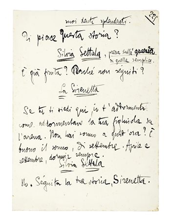 Manoscritto a inchiostro nero. 1 carta scritta al recto. Dimensioni 180x260 mm. (1) Si tratta di un foglio tratto dalla scena I del IV atto de La Gioconda. Incipit: [...] suoi denti splendidi. La Gioconda, unica tragedia dannunziana ambientata in toscana, fu pubblicata nel 1898 e rappresentata per la prima volta l'anno successivo a Palermo, con Eleonora Duse nel ruolo della protagonista Silvia Settala. Il testo presente in questo foglio presenta alcune piccole varianti rispetto alla versione definitiva. -
