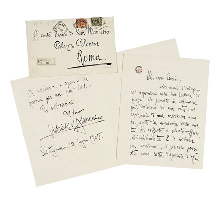Lotto 21 D'Annunzio Gabriele, Lettera autografa firmata, inviata al conte Enrico di San Martino. Datata 12 luglio 1905, Settignano.