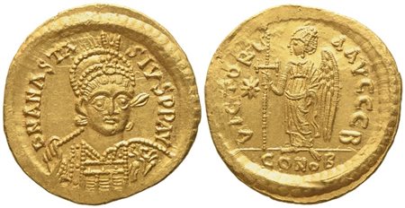 Lotto 1 Costantinople. D N ANASTASIVS P P AVC, helmeted and cuirassed bust facing slightly r., holding spear and shield; Rv. VICTORIA AVCCC Γ, Victory standing l., holding long cross; to r., star; in exergue, CONOB. DOC 7c; Sear 3. Minor scratches, otherwise good extremely fine.
