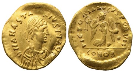 Lotto 6 D N ANASTA - SIVS P P AVG Diademed, draped and cuirassed bust r.; Rv.VICTORIA AVGVSTORVM Victory walking r., head l., holding wreath and globus cruciger; in field r., star. In exergue, CONOB. DO 10a; MIB 1, 11; Sear 8. Flan slightly bent, otherwise good extremely fine.