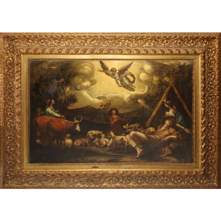 Lotto 10 Angelo che annuncia ai pastori la nascita di Gesù, Emilian scuola 17° secolo cm 25,5X97 in cornice cm 103X133 olio su tela