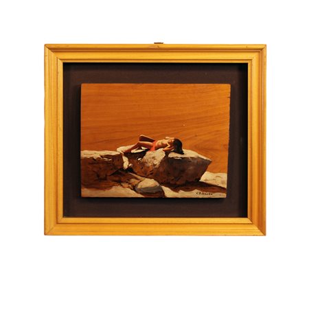 Lotto 5 V. RIBAUDO OLIO SU TAVOLA raffigurante nudo di donna su uno scoglio dentro cornice in legno h cm 26 x 35 / cornice h cm 46 x 52