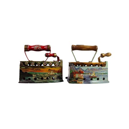 Lotto 11 DUE FERRI DA STIRO in ghisa dipinti raffiguranti marine con barche e personaggi firmati Francesco Paolo Cardinale Sicilia XX secolo Sicilia XX secolo h cm 17 x 20