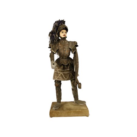 Lotto 21 PALADINO SICILIANO con testa e armi in legno, abiti in metallo sbalzato e stoffa montati su base in legno rivestito in stoffa manifattura siciliana XX secolo manifattura siciliana XX secolo h cm 110 x 41 x 35