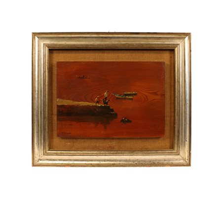 Lotto 22 V. RIBAUDO OLIO SU TAVOLA raffigurante paesaggio costiero con barche e persone dentro cornice in legno laccato argentato h cm 29 x 41 / cornice h cm 51 x 60,5