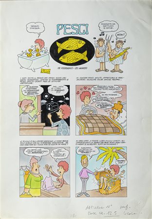 Lotto 1 LILLO La serie dei segni zodiacali. 1999. Chine colorate su Cartoncino Schoeller. Cm 36,00 x 25,00. Tavola sul segno zodiacale dei Pesci con velina trasparente di protezione.