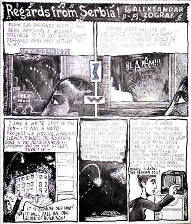 Lotto 13 Zograf Aleksandar "REGARDS FROM SERBIA". 1999. China su carta. Cm 18,00 x 21,00. Tavola realizzata da Zograf durante i bombardamenti della Nato, la famigerata operazione chiamata BOMBE INTELLIGENTI, aprile 1999 nelle poche ore di luce a disposizione.