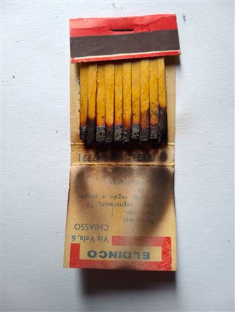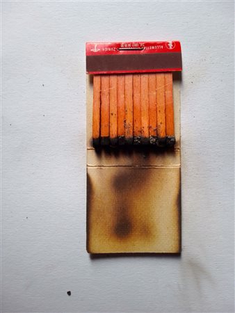 Lotto 17 BERNARD AUBERTIN (1934-2015) Titolo -Fiammiferi Bruciati- CM 7.5X5 Scatola intera di fiammiferi bruciati, 2010 Opera Unica Incollata su Foglio con Firma Autentica dell'Artista CM 30X21