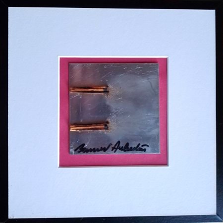Lotto 16 BERNARD AUBERTIN (1934-2015) Titolo -Fiammiferi Bruciati- CM 7.5X5 Scatola intera di fiammiferi bruciati, 2010 Opera Unica Incollata su Foglio con Firma Autentica dell'Artista CM 30X21